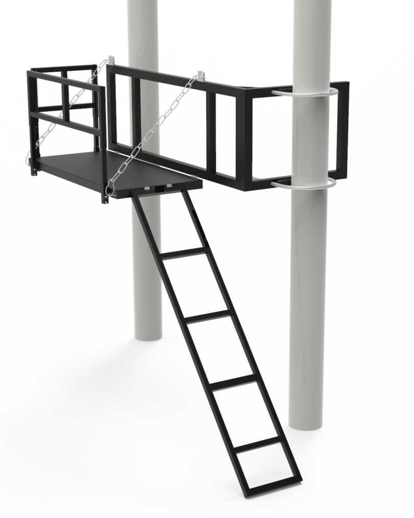 户外柱上变压器及电气柜的安装位置一般高于2.5米,需专门携带梯子进行检修工作,在偏远农村地区以及泥泞路面梯子搬运不便,且大大影响检修安全,影响正常工作的展开。针对以上突出问题,本公司研发出一种结构简单、方便操作,提高工作效率的固定式安全作业登高平台,直接安装于设备柱上,大大方便检修人员的正常工作展开,降低安全隐患。